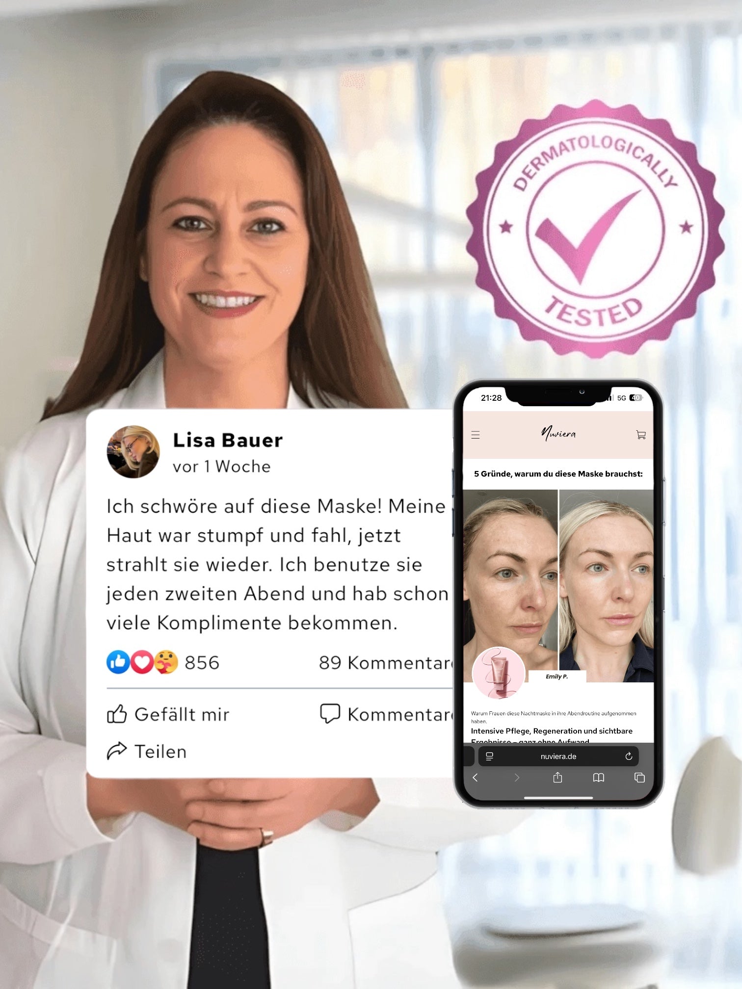 Hautverträglichkeit klinisch geprüft – keine Reizungen, kein Brennen. Über 92 % der Testerinnen berichten nach wenigen Anwendungen von sichtbar glatterer, prallerer Haut. Du spürst sofort: Diese Maske funktioniert wirklich.💫